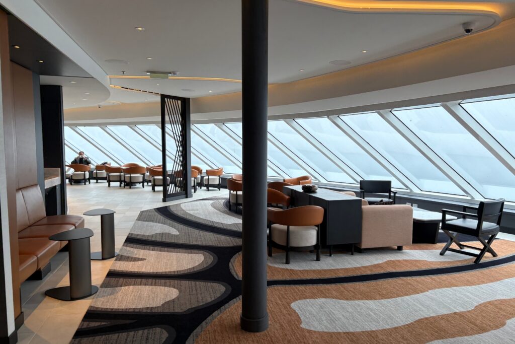 Here’s one of the lounges on board Norwegian Aqua, located toward the front of the ship. You can sit here and enjoy a great view out to sea — it’s a peaceful spot that feels similar to an observatory, perfect for watching the horizon in comfort.