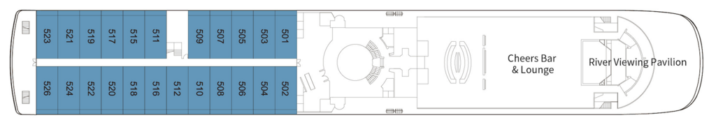 Located on the bridge deck, upper deck and promenade deck, these Deluxe cabins measure 28 square metres. The floor-to-ceiling glass doors slide away to extend your already spacious living space onto your private balcony, complete with comfortable outdoor seating – the perfect place to sit and watch the riverbanks glide by.