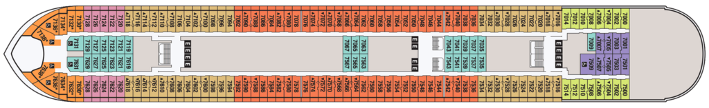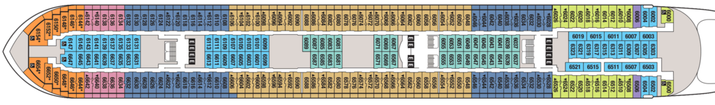 Rooms on Decks 1 and 2 offer Guests convenient proximity to shipboard restaurants and nightclubs while Decks 5, 6 and 7 are upper decks with more commanding views.