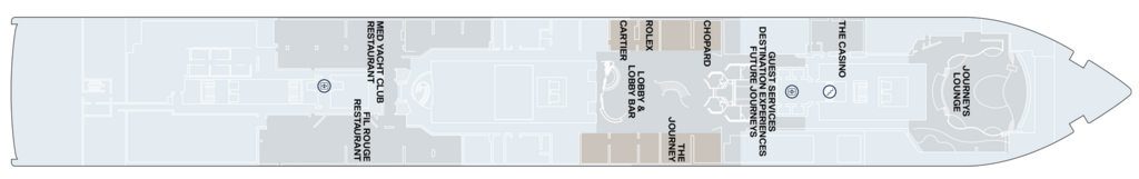 Set on the ship’s highest point, on deck 14, this panoramic outdoor lounge setting is ideal for soothing cocktails and infinite views.