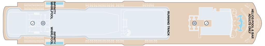 Inspired by the Ancient Greek god of the sun, and also literally meaning “sun” in Greek, this adults-only area is indeed the sunniest venue onboard, panoramically facing forward on deck 12. Enjoy lying by the pool or lounging throughout the day as you watch the ship sail through the sea.