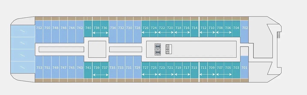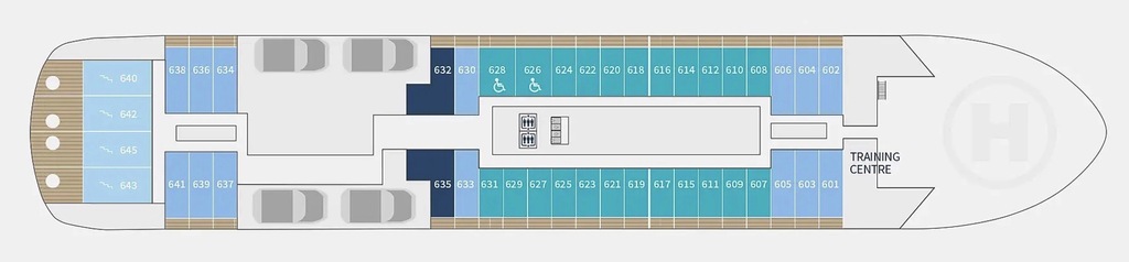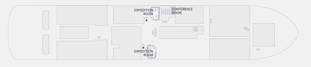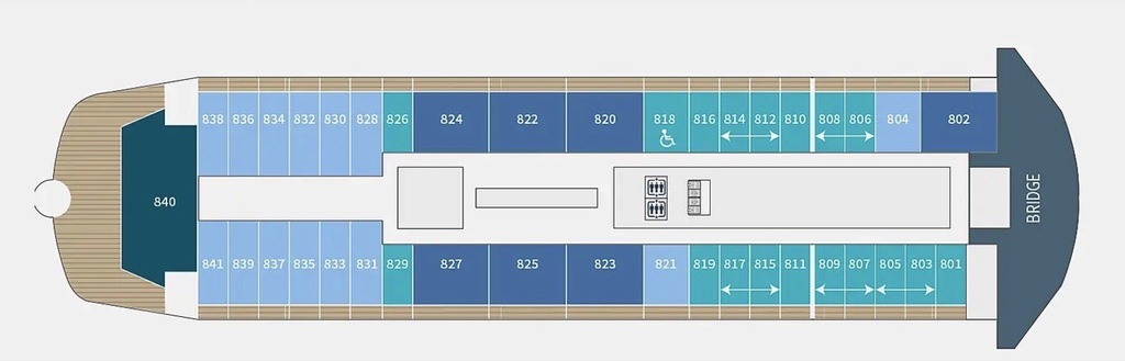 The outside promenade deck is uninterrupted. This means that, unlike most passenger ships, it is possible to walk all the way around the ship and to the bow. It is also equipped with benches heated by energy recovery and two Swarovski Optik telescopes.