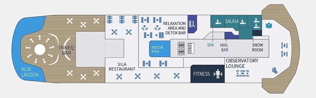 • Blue Lagoon pools, an outdoor heated lagoon with a temperature that ranges from 27 to 37° C using recycled energy from the ship