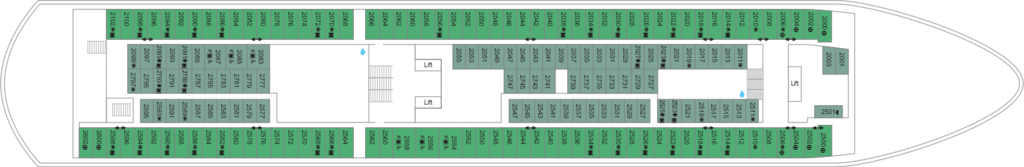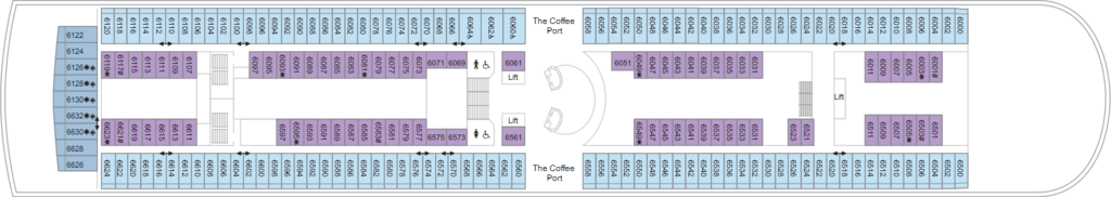 You’ll get twin beds that convert to a queen-size double bed and an en suite with a WC and a shower. Deck 2/3 Inside Cabins cover 12 and 13 m². These cabins have fold-down beds for extra sleeping space.
