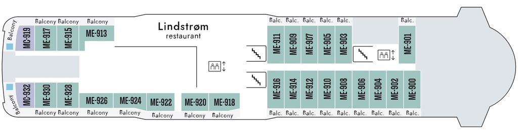 High deck cabins with balcony. Spacious cabins, different sizes, flexible sleeping arrangements with double bed that can be divided into two single beds, some with sofabed, TV, kettle, tea and coffee. With limited view.