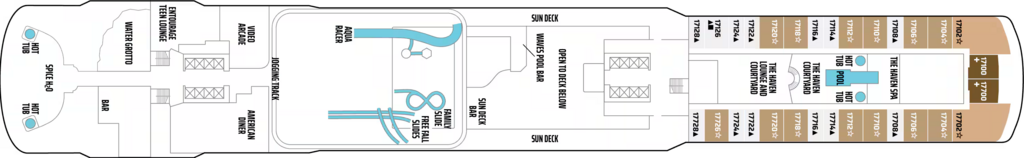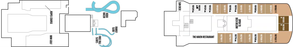The Haven Penthouse Suites are located toward the front of the ship and offer a spacious balcony, king-size bed, separate vanity area and a shower and jacuzzi. (Sleeps up to two)
