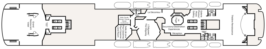 Located at the front of the ship on the highest deck, Le Panoramique offers stunning 180° view across the bow of the ship. The ideal place to while away the hours on a sea day enjoying the scenery from one of the best seats in the hours. Come the evening, the atmosphere changes and you can dance until late with our live band and DJ.