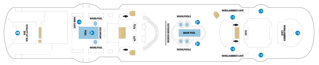 Why watch a movie inside? Lounge on the pool deck with an ocean breeze, the moon, and movie stars as big as all outdoors. The 220 square foot movie screen presents first-run movies, live sporting events and more at the pool area on select ships.