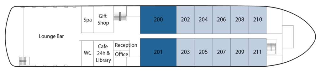 The Upper deck also features the reception and the cosy library and coffee area, ideal for a peaceful moment with a book or a chat with fellow travellers.