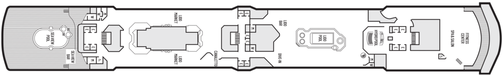 The Sea View Pool aft of deck 9 is the ship’s open air pool featuring two whirlpools and served by the Sea View Bar and Slice the pizzeria.